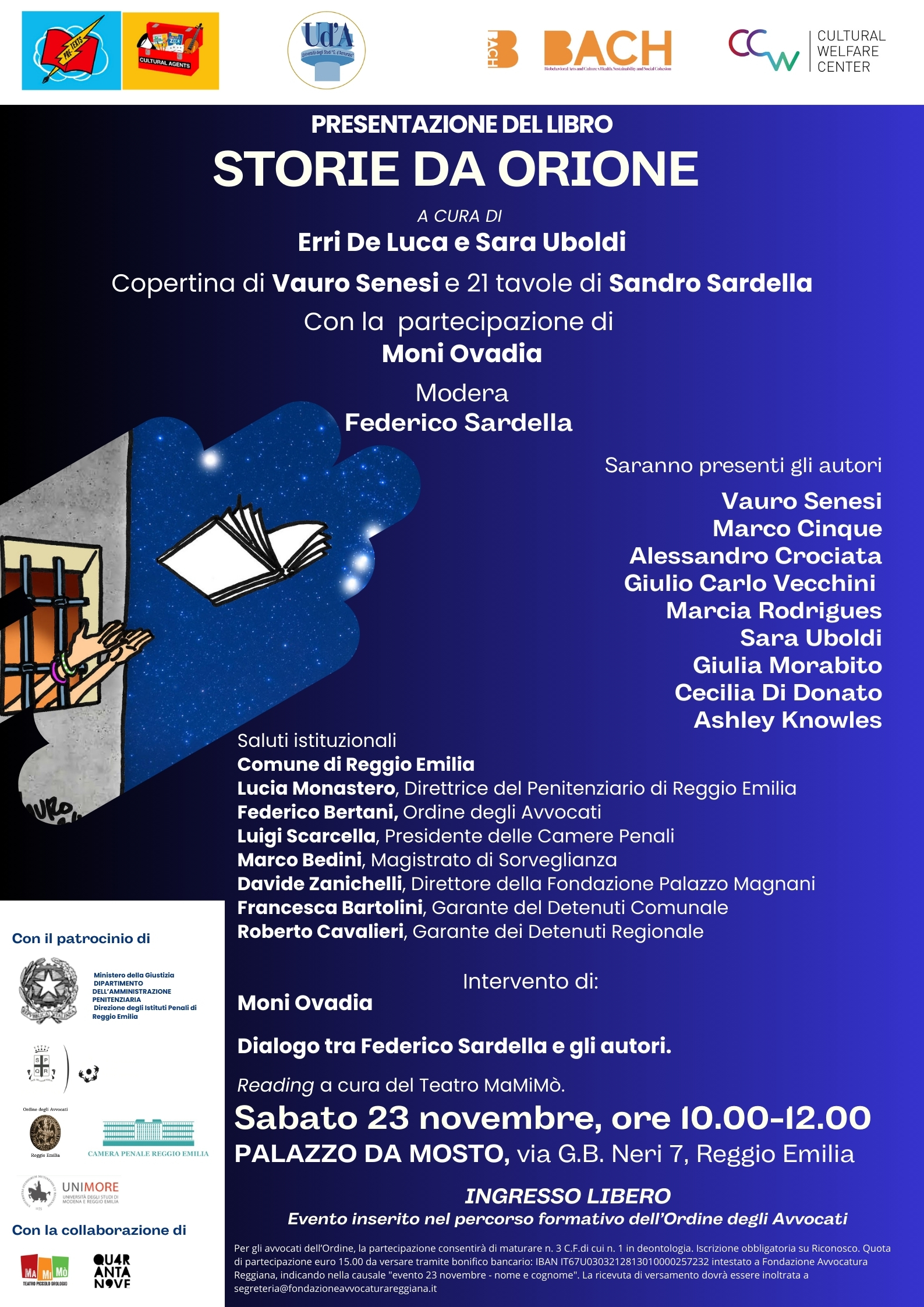 In una due giorni di eventi, il 22 e 23 novembre, a Reggio Emilia verrà presentato il volume ”Le Storie da Orione”: il racconto, attraverso le storie delle partecipanti, del programma Pre-texts in carcere. Un lavoro a cura di Erri De Luca e di Sara Uboldi, sotto la direzione editoriale di Federico Sardella.
